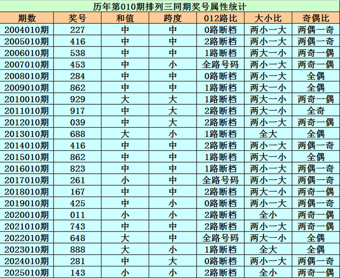 历史上第2026010期陈列三已开出22期奖号了,积年同时奖号折柳为:227、416、538、453、284、862、929、917、039、688、416、862、823、261、167、425、011、743、648、888、281、143,详备统计见下表: