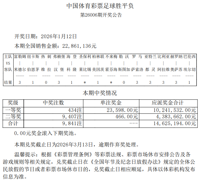 北京市延庆区体育运动学校 足彩26006期开奖:14场434注2.3万元 二等466元