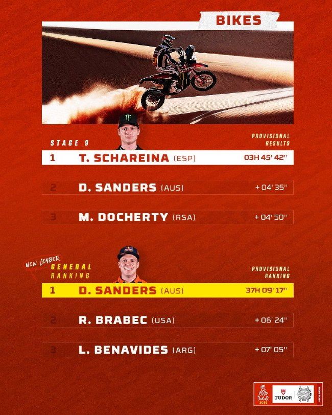 今天大部分摩托车手在开赴后齐遭受了迷途的问题,但本田车队车手托沙·沙雷纳(Tosha Schareina)奏效地找到了正确的阶梯。临了他向上KTM车队车手丹尼尔·桑德斯(Daniel Sanders)6分24秒取得了赛段冠军。